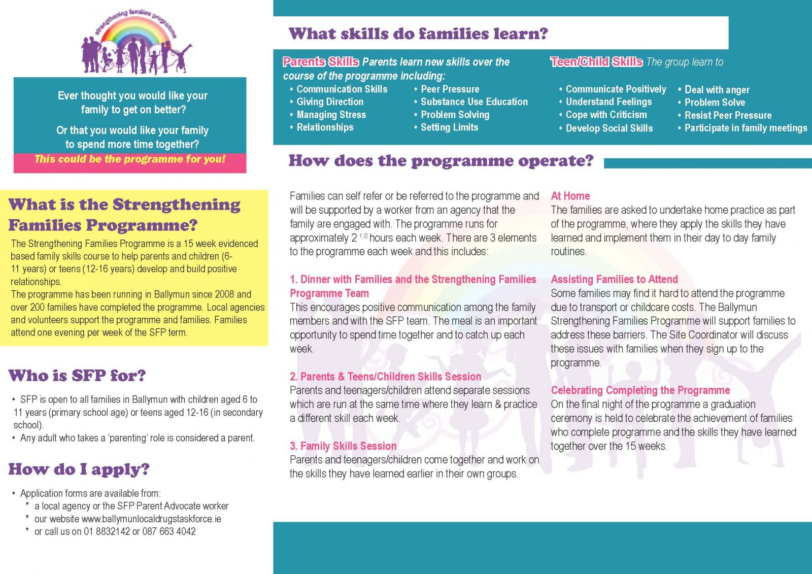 For more information on the Ballymun Strengthening Families Programme please contact Mary Fitzpatrick on 01 883 2142 or by e-mail: marysfp@ballymundtf.ie